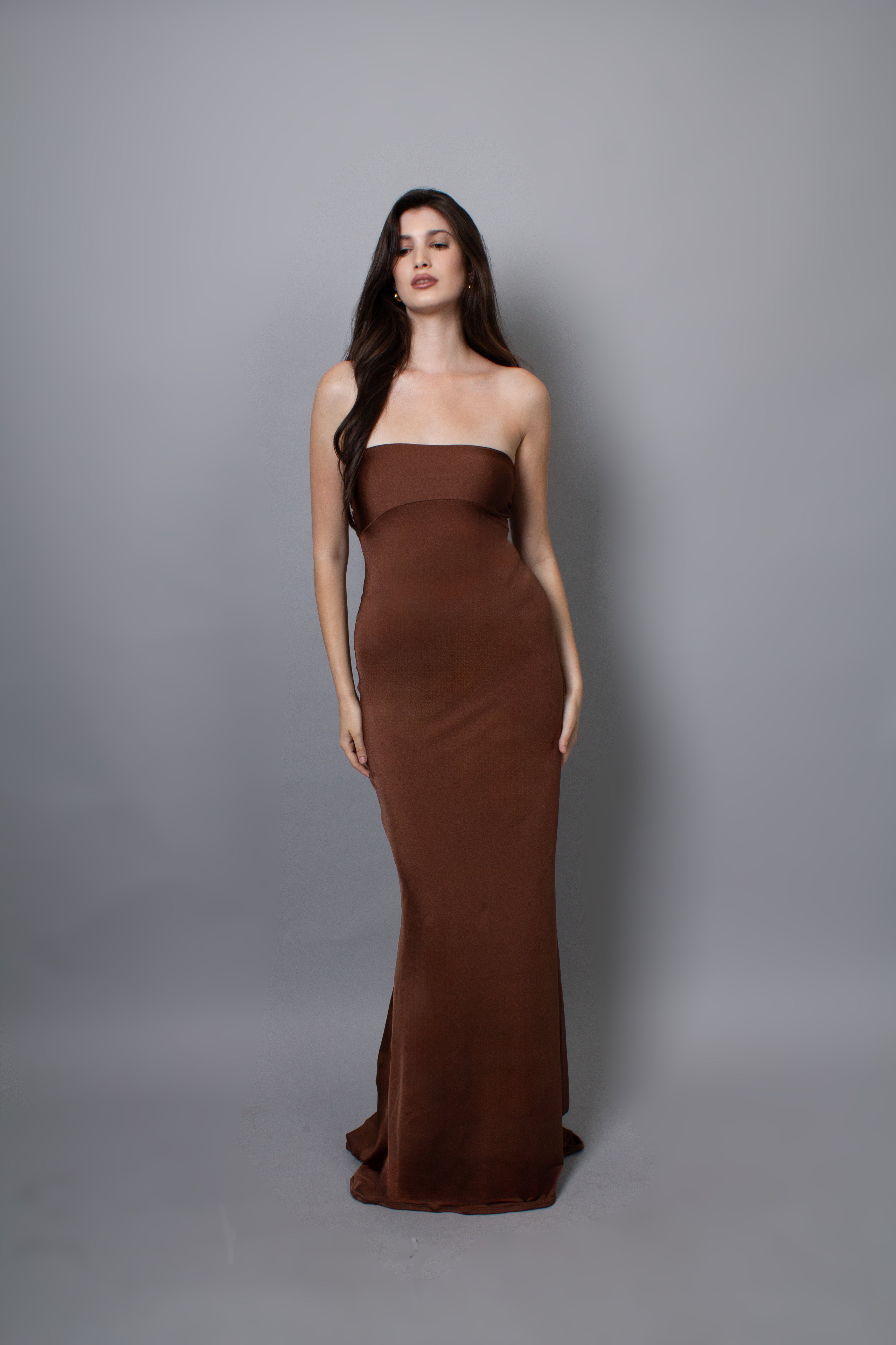 A SLINKY MAXI DRESS MADE FROM A COMPRESSIVE HIGH STRETCH MATERIAL. THIS PIECE HAS A SCULPTING FIT WITH A FISHTAIL SHAPE HEM. THE CONTOURING BUST SEAM ENHANCES AN HOURGLASS SHAPE.